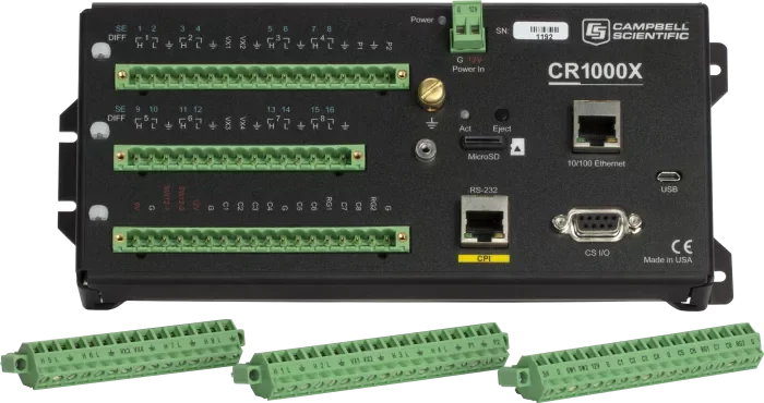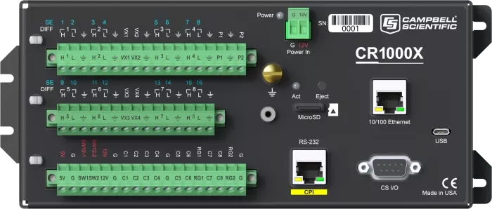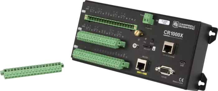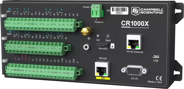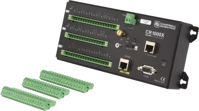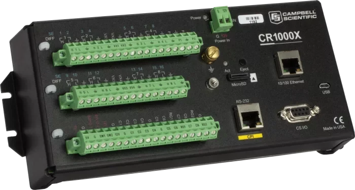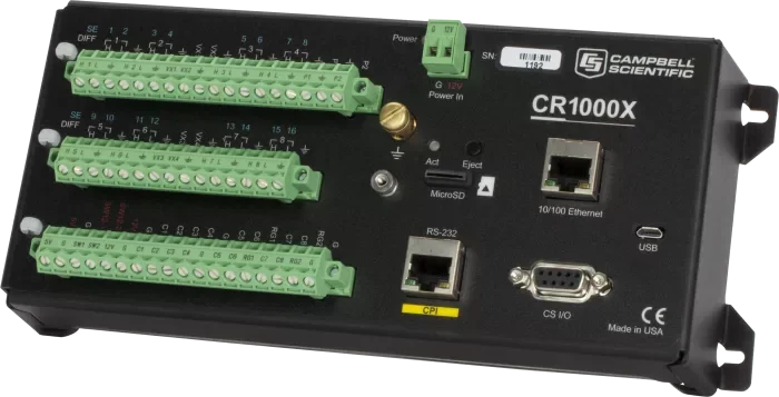 CR1000X 是一款旗舰型产品,在测量和控制方面可满足广泛的需求。CR1000X 的可靠性和坚固性,使其可应用于气象站、中尺度气象网、风廓线、空气质量监测、水文系统、水质监测、水文气象站等领域。CR1000X 同时具备低功耗优势,该优势体现在传感器测量、直接 / 远程通讯连接、数据分析、外部设备控制、数据和程序存储等方面。CR1000X 采用密封装置屏蔽射频干扰,具备精密时钟、类 BASIC 编程语言、数据处理和分析等功能。